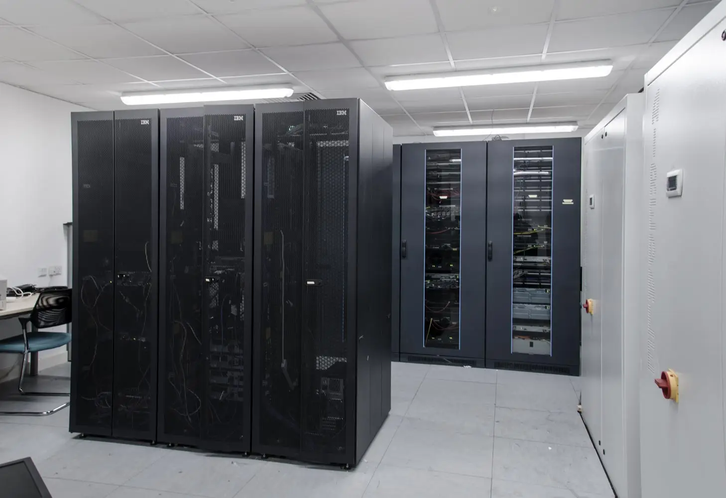 Surface luminaires, often mounted on lighting trunking, are commonly used in server aisles. Optical performance is important because the work surfaces are vertical, so luminaires with a wide distribution pattern should be used.