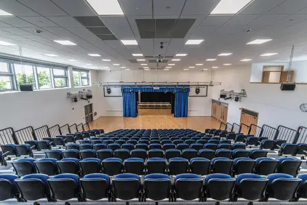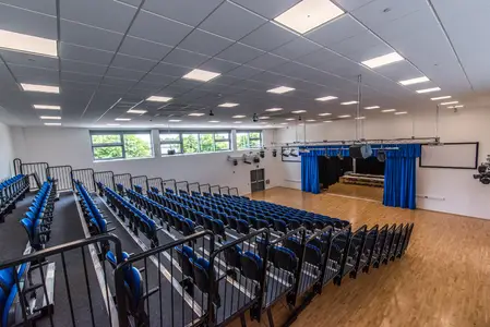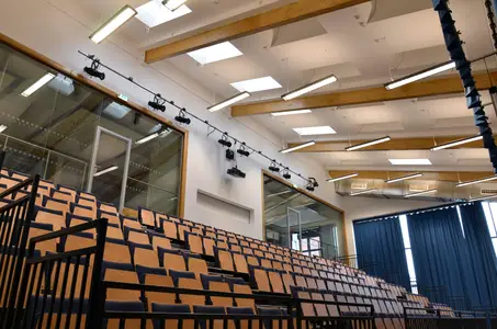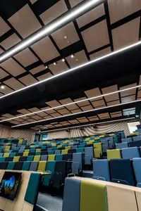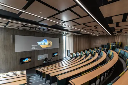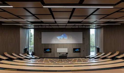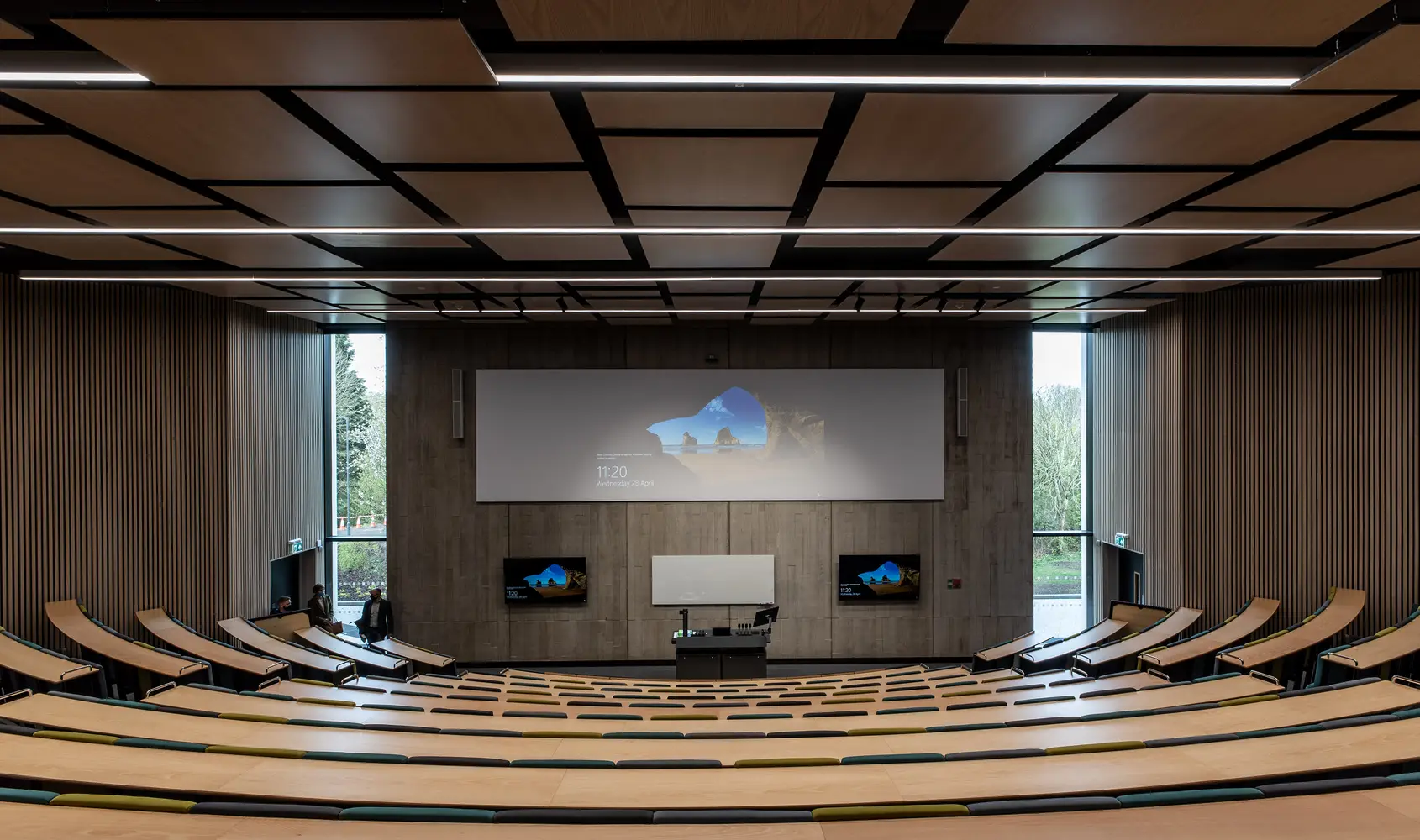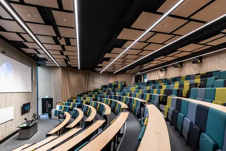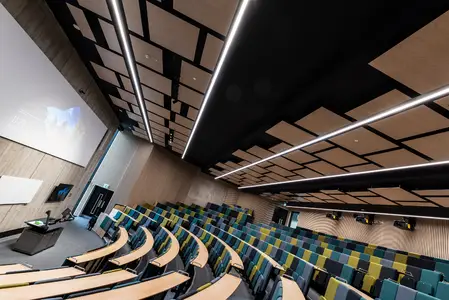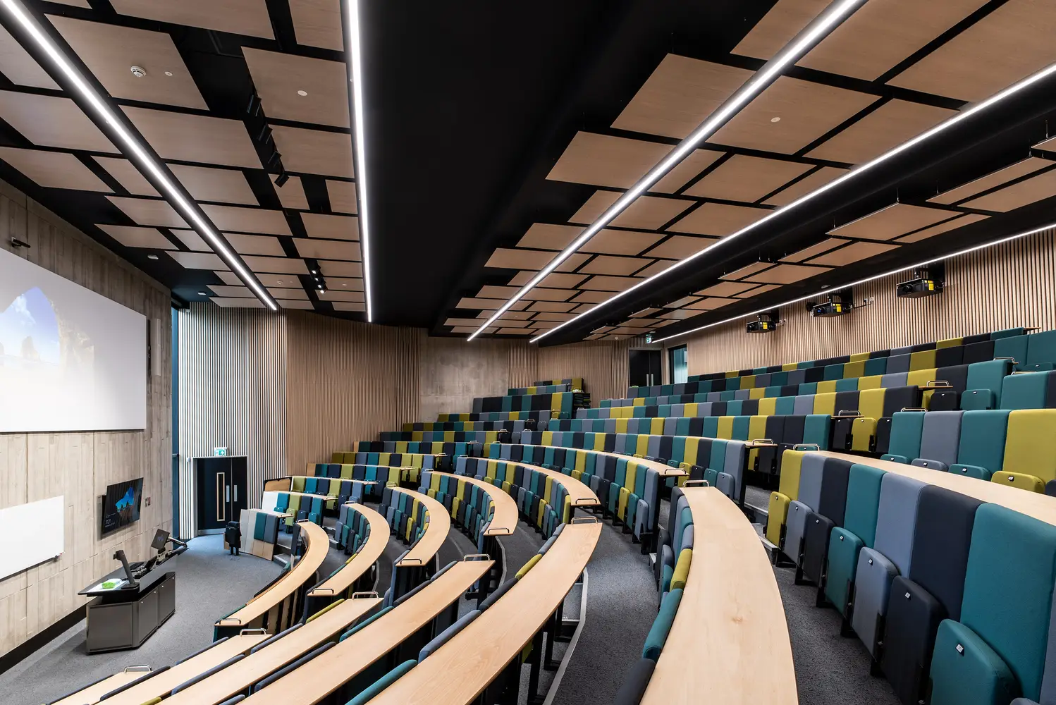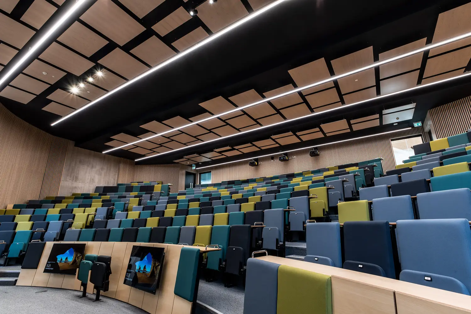 Lecture theatres can pose challenges to the lighting designer. In a lecture theatre the lecturer must be clearly visible to the audience, without deep facial shadows and without creating a glare issue. Those seated towards the rear may be very close to the ceiling, so it is essential that the luminaires do not cause glare issues for them.