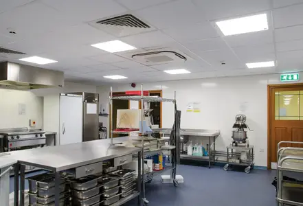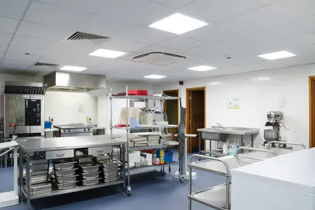 The luminaires should be easily cleaned and be constructed of materials with finishes which will withstand frequent cleaning and possibly hosing down (IP55 minimum) often with corrosive chemical agents.