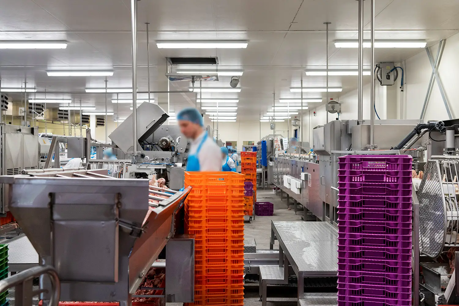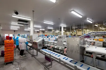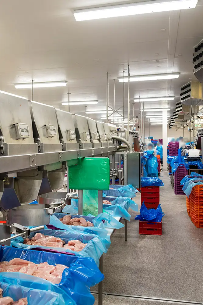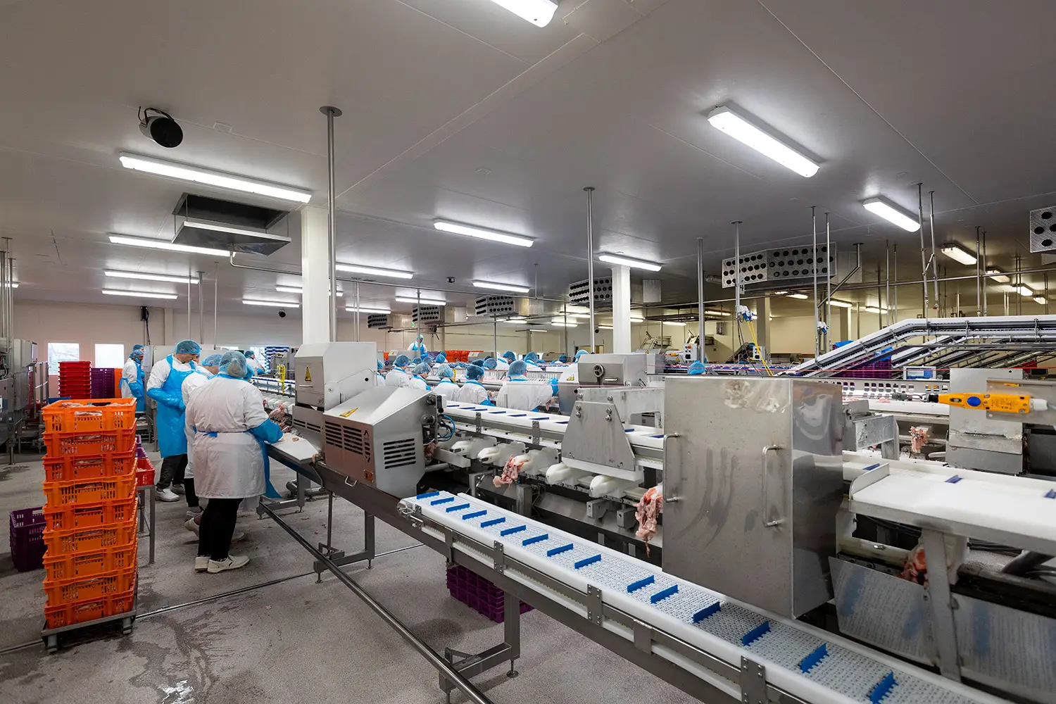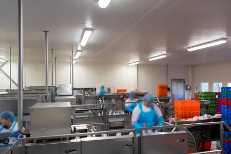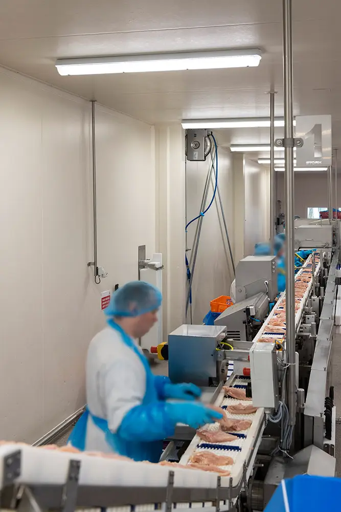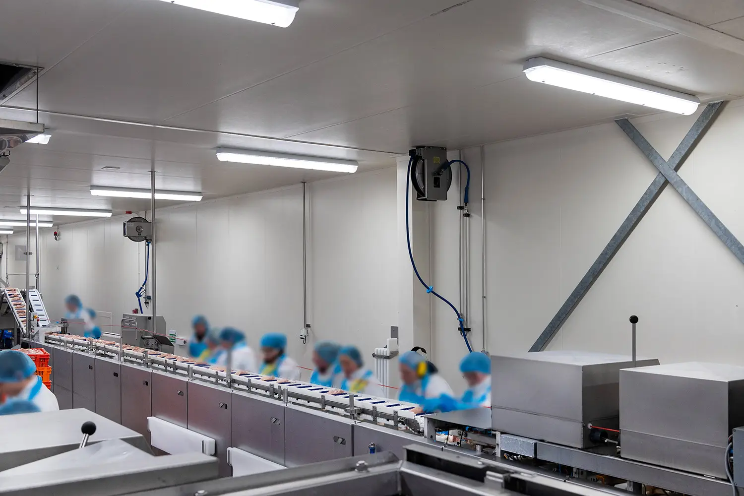 In areas where food is processed openly, the Food Hygiene (General) Regulations require that luminaires near the product be housed in an enclosure which prevents the lamp or any part of the luminaire accidentally falling into the product.