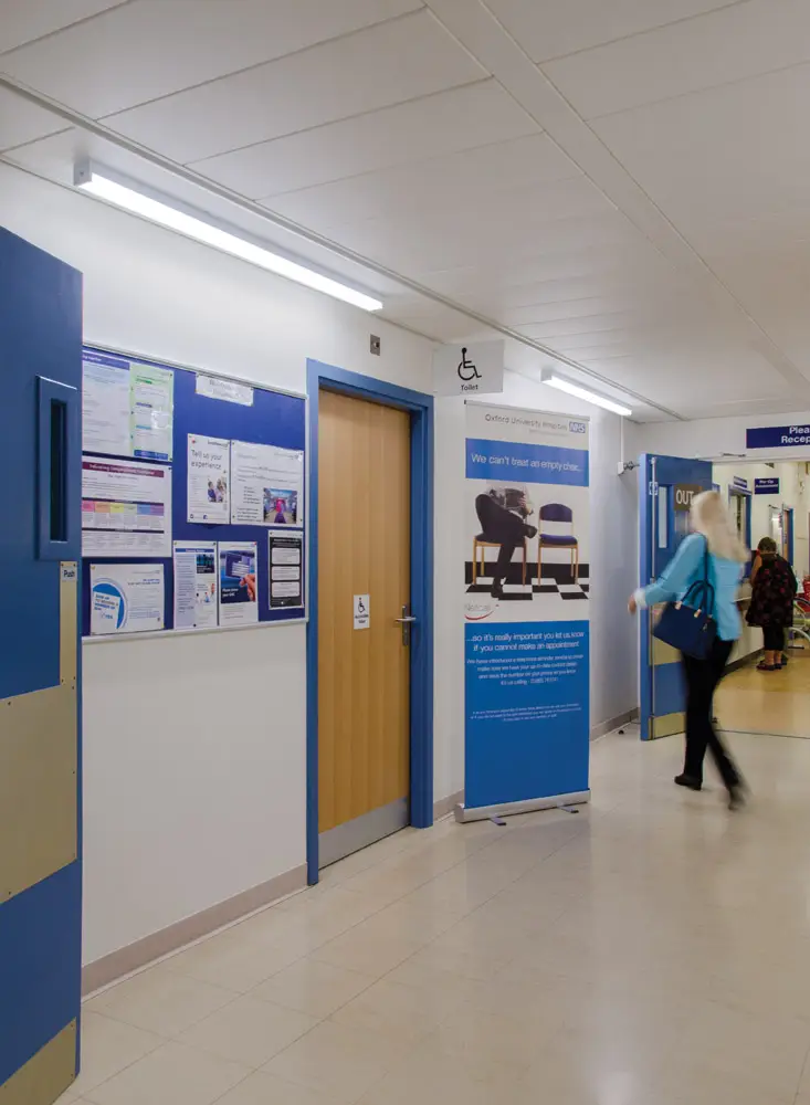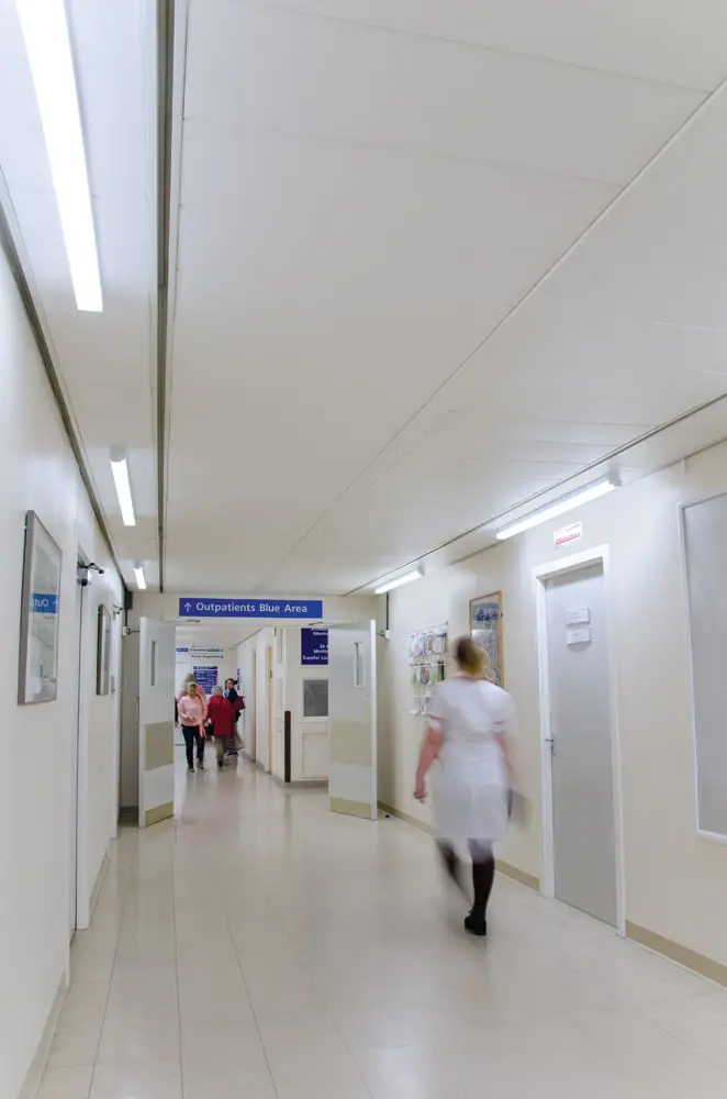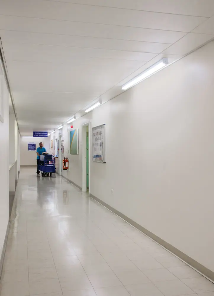 The Radiance Corridor with its asymmetric distribution means that the corridor can be illuminated with off-centre luminaires, avoiding discomfort glare for patients being transported on trolleys.