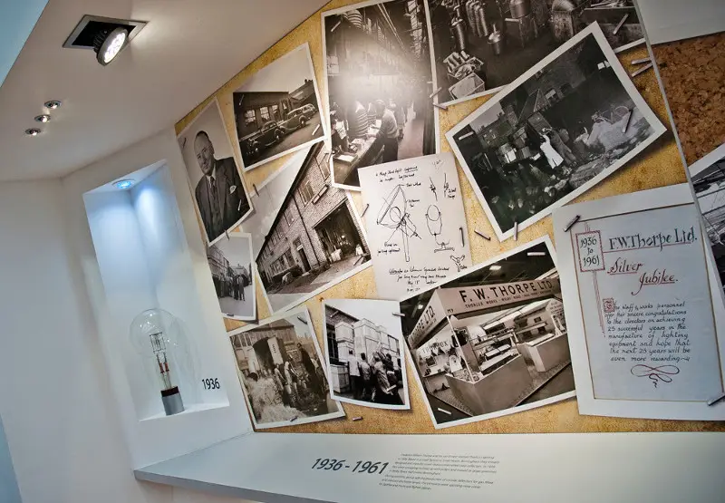 A photographic timeline incorporating documents and pictures from as far back as 1936 through to the modern day emphasised the changes in production methods and technology over the last 75 years. Central to the display were an original nose-cone from a Spitfire aircraft, spun at the Thorlux factory during World War 2, and a 1940s vitreous enamelled reflector.