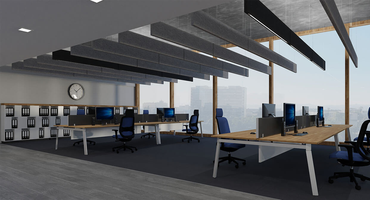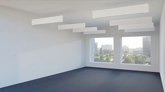 This office space has a floor area of 48 m² and has been treated with 8 Flexbeam luminaires resulting in a reverberation time of 1.17 Tmf. No additional acoustic material is required. The Flexbeam luminaire provides all the acoustic attenuation. This results in a clearer ceiling.