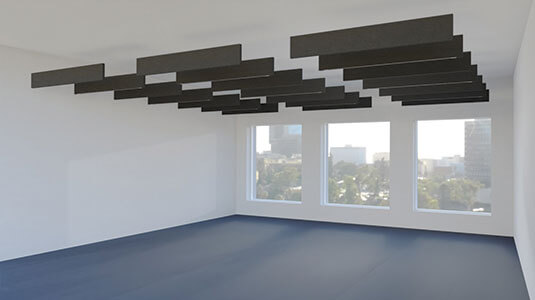 Meeting rooms can vary in size and shape and can often require a creative lighting solution. This large meeting room has a floor area of 28 m² and has been treated with 4 Flexbeam luminaires and 11 plain Flexbeam baffles resulting in a reverberation time of 0.80 Tmf.