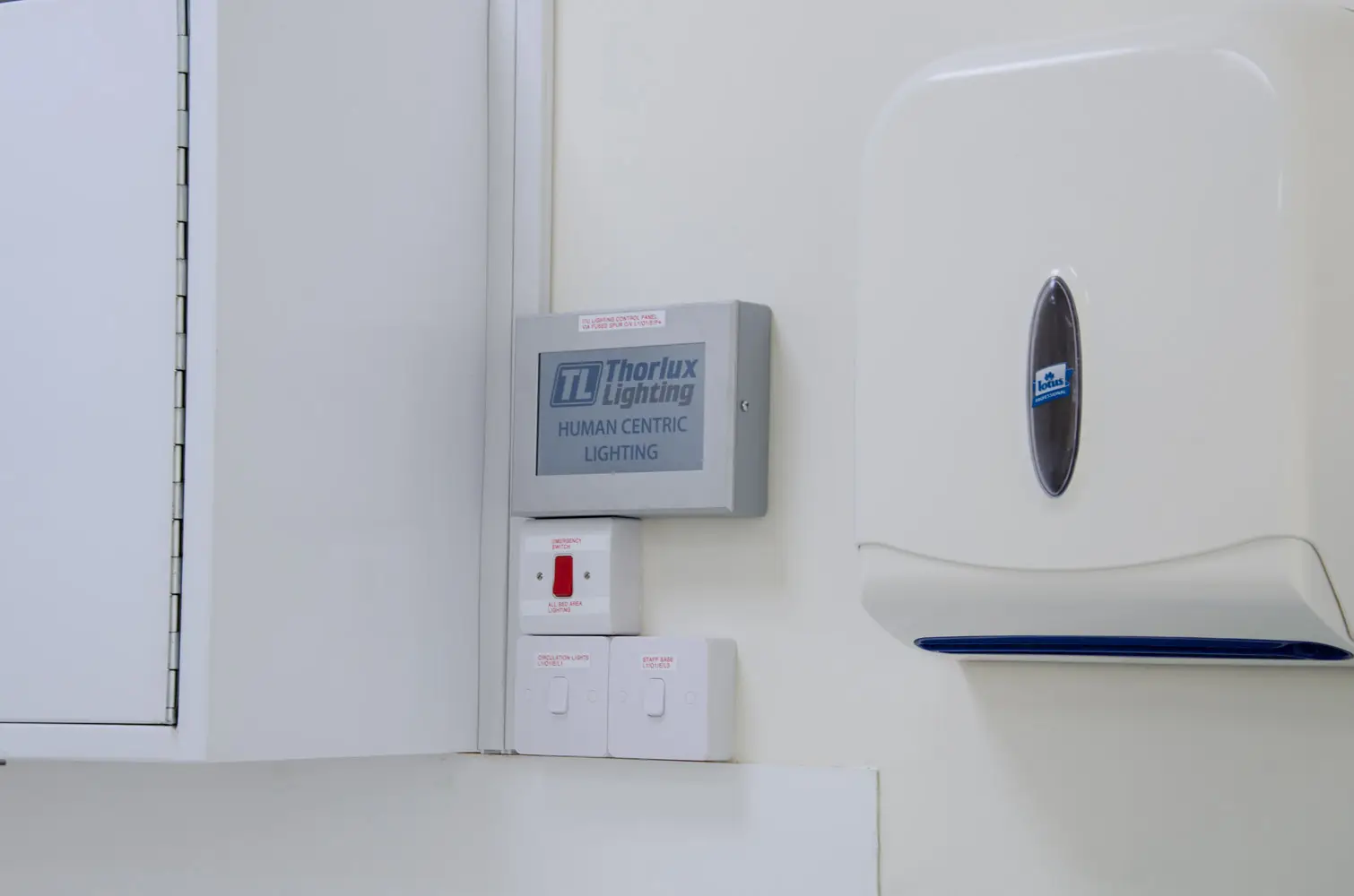 The Intensive Care Unit (ICU) at Barnsley General Hospital provides a service of care for critically ill or injured patients who require constant medical support and intensive monitoring. The lighting control system installed is from the Thorlux ColourActive range, which cycles the colour temperature of the light source over a 24 hour period. The colour temperature (CCT) of the luminaires varies from 3000K to 6500K to replicate natural daylight changes. In addition, the system is dimmable providing individual lighting level control within each bed bay, whilst maintaining outstandingly high uniformity and a shadow free working platform for staff. Crash scenes are included at each bedhead, and for the full ward, to give maximum output (1000 lux +) from one fail safe switch.
