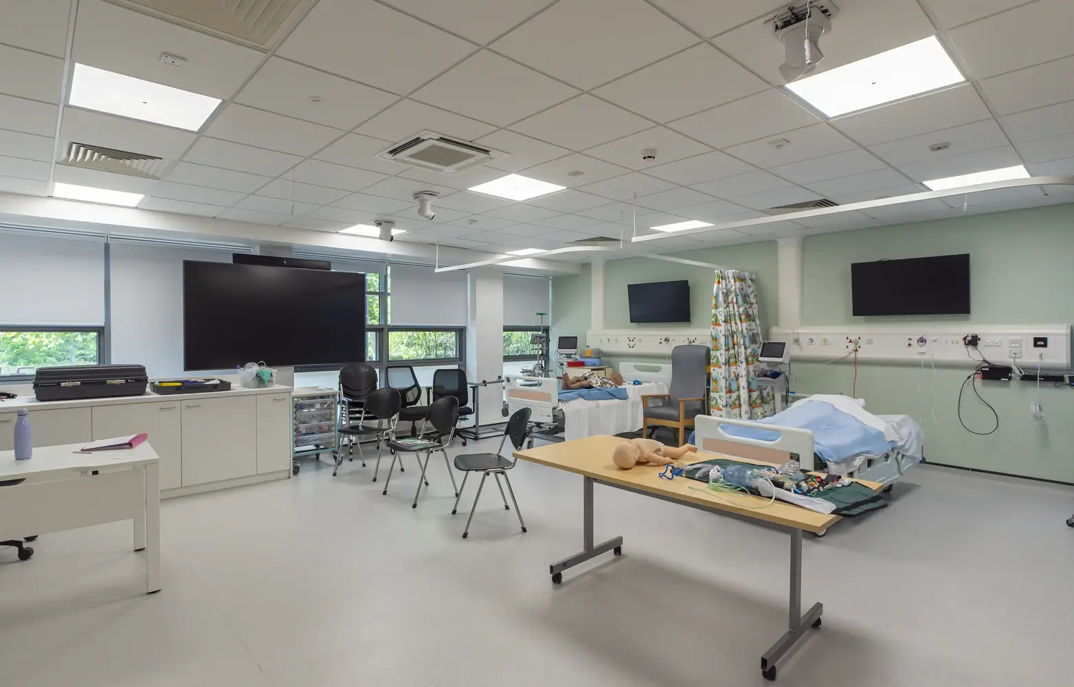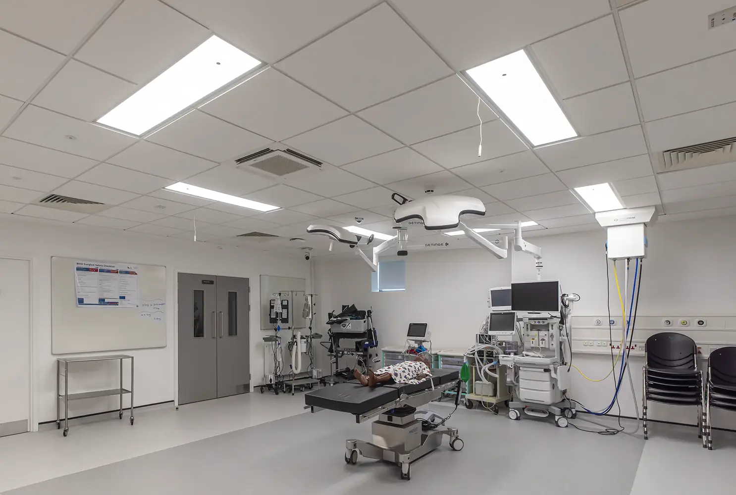 Key applications throughout the rest of the building include the use of suspended track-mounted Kanby Zip luminaires in the library to ensure good levels of vertical illumination on the book racks (essential for comfortable browsing); linear Flexbar Diffuser luminaires drawing attention to the front of presentation and lecture spaces; and high-CRI, cool illumination with Radiance luminaires in the simulated ward spaces, as would be found in a real hospital.