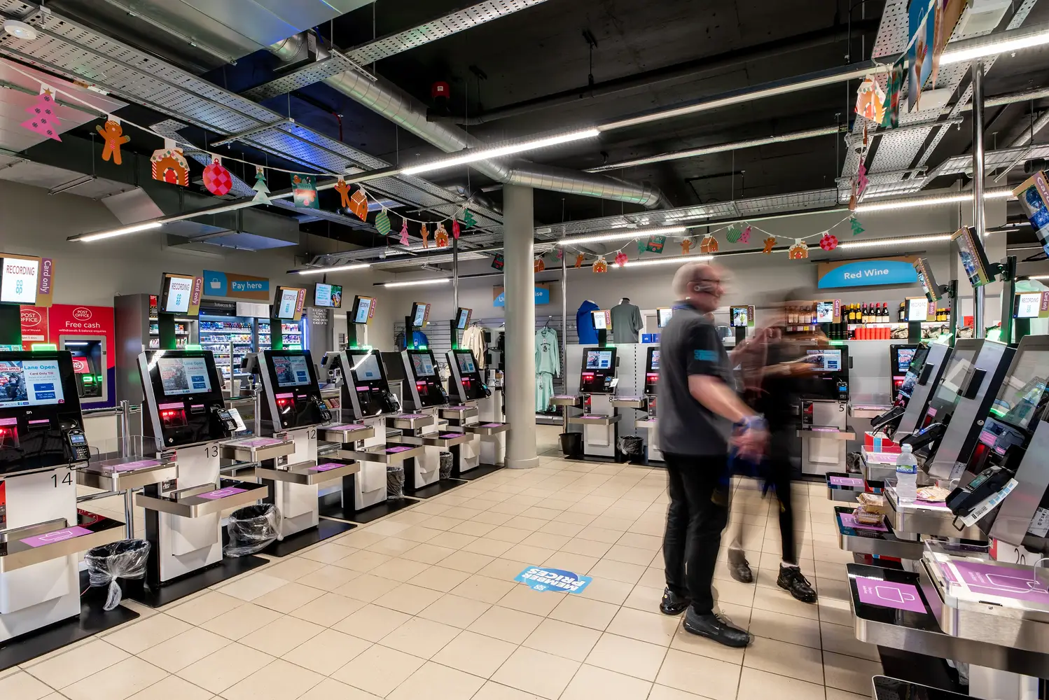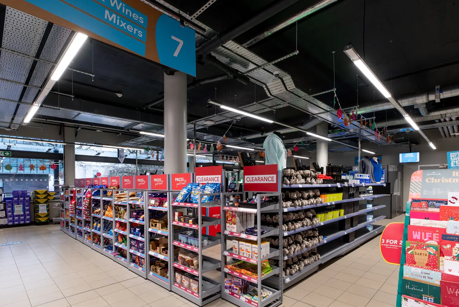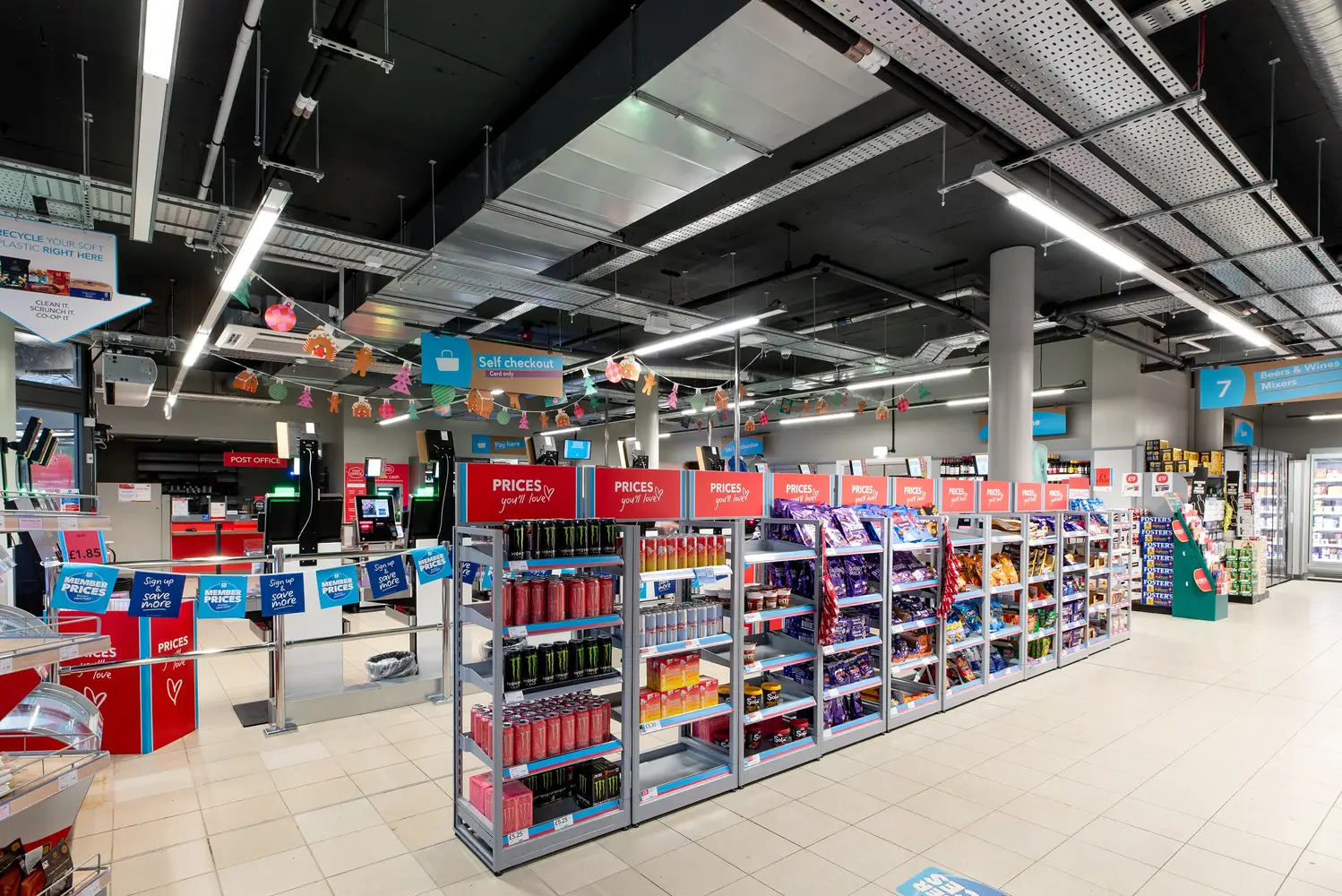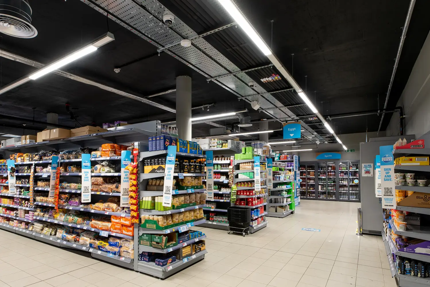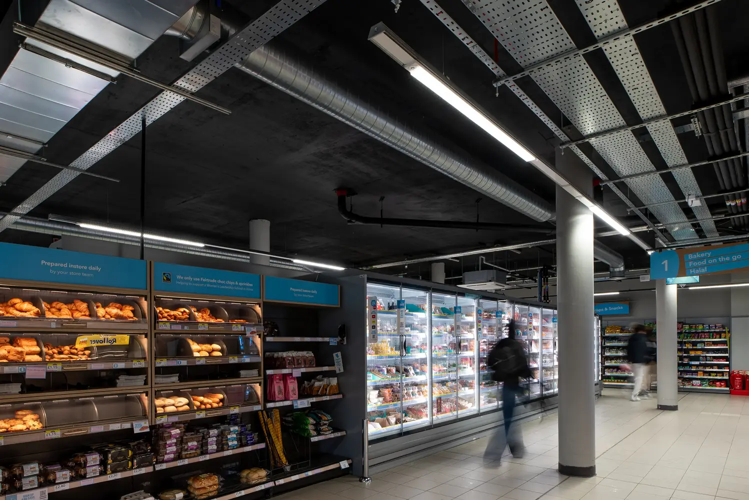To provide essential safety lighting, Firefly emergency luminaires with area and corridor distribution have been installed throughout the store, with Lexi-65 exit signs highlighting escape points. The wireless SmartScan lighting management system controls the supermarket lighting.