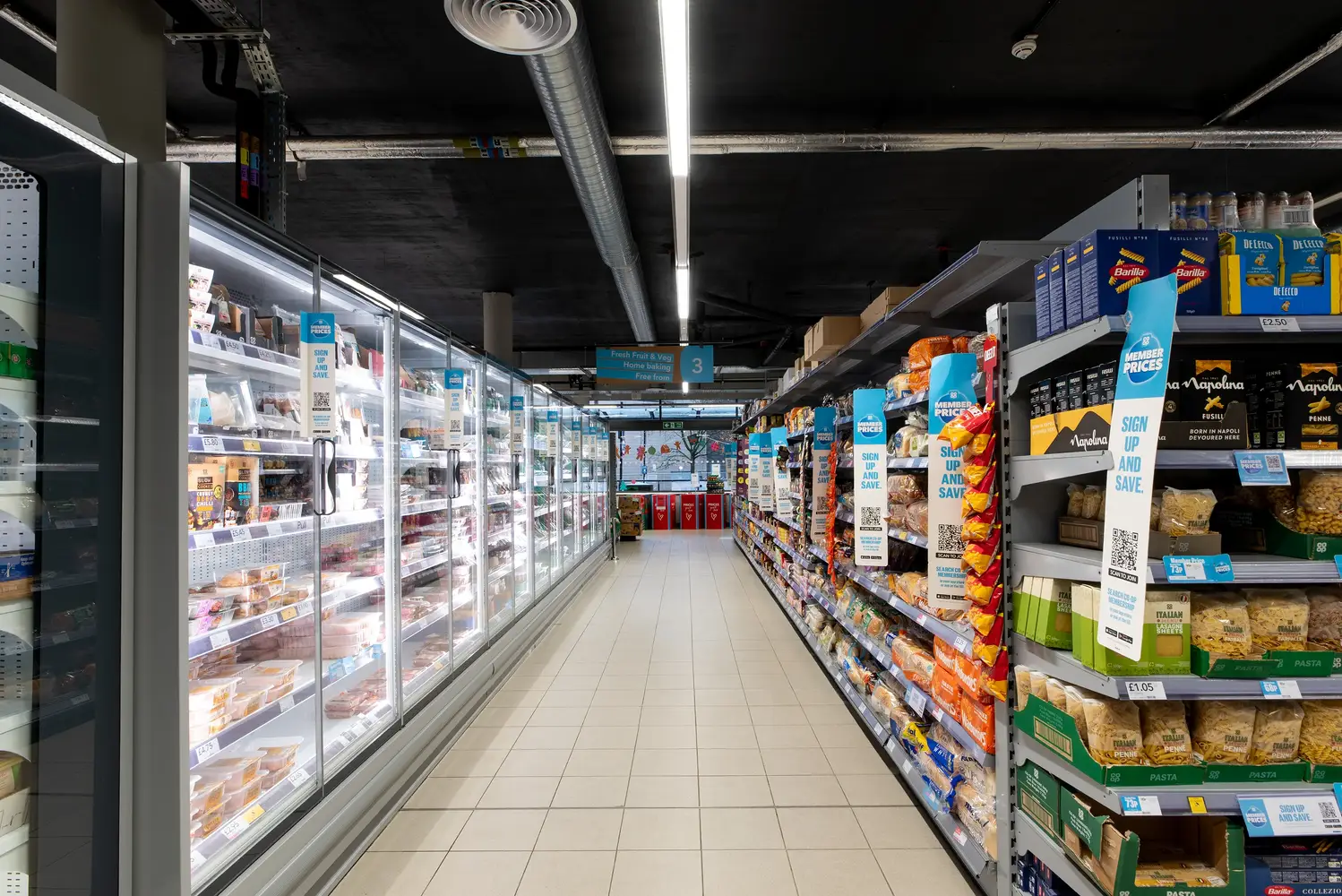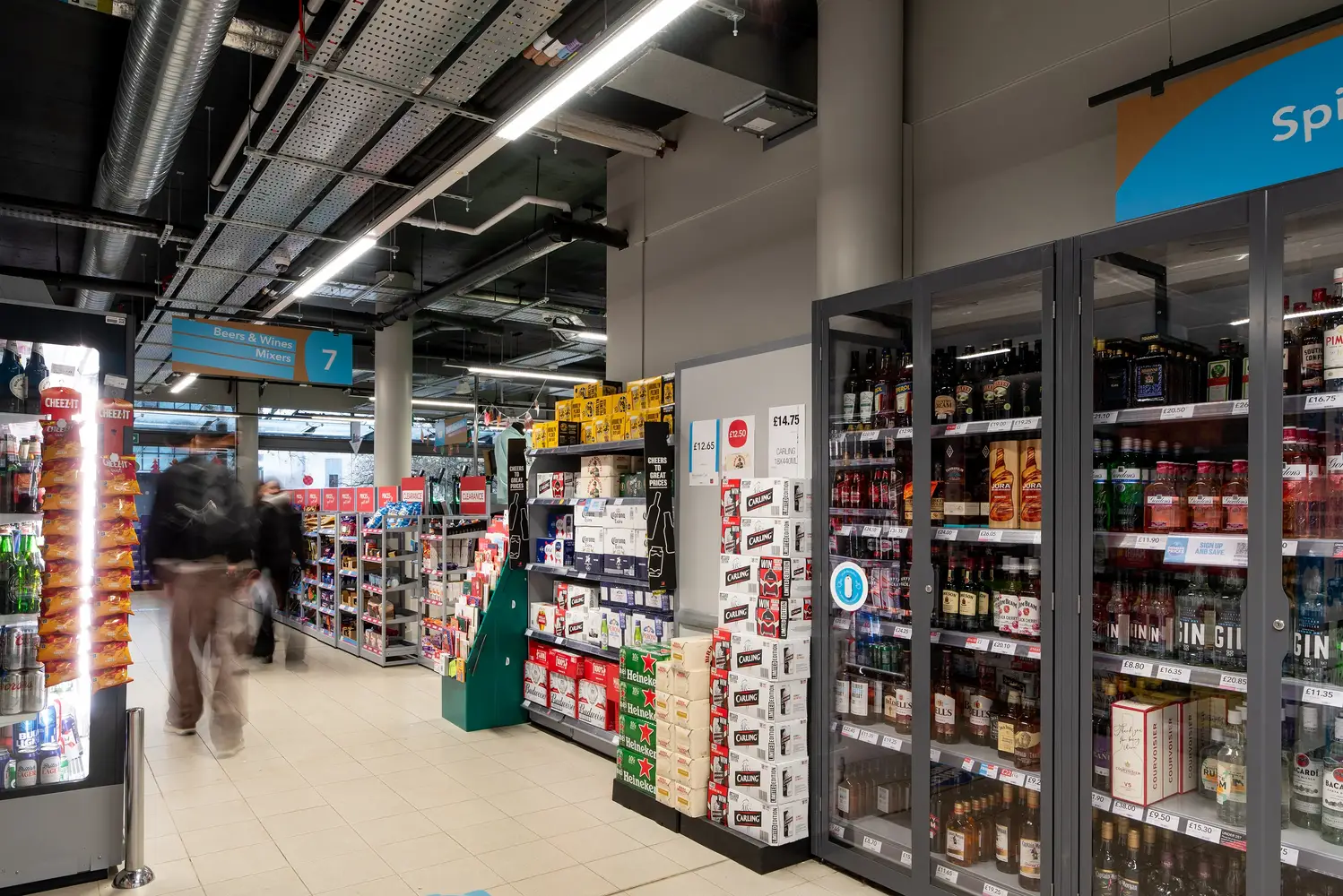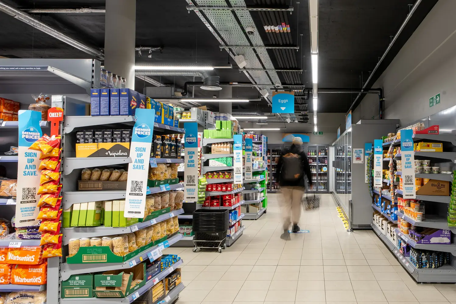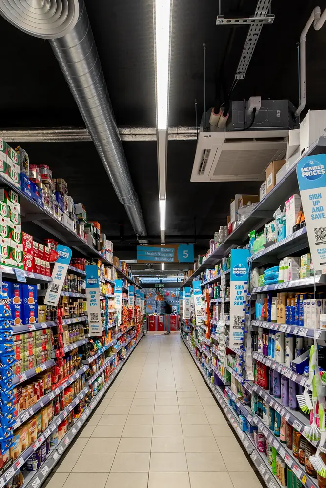 To provide essential safety lighting, Firefly emergency luminaires with area and corridor distribution have been installed throughout the store, with Lexi-65 exit signs highlighting escape points. The wireless SmartScan lighting management system controls the supermarket lighting.