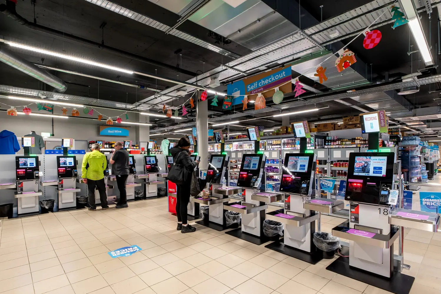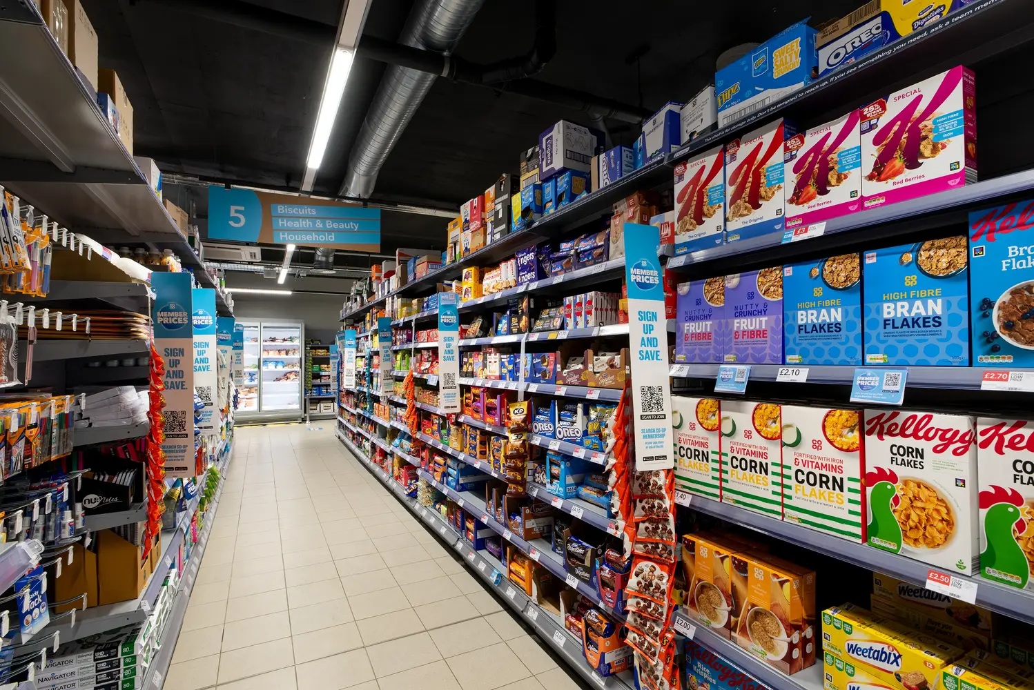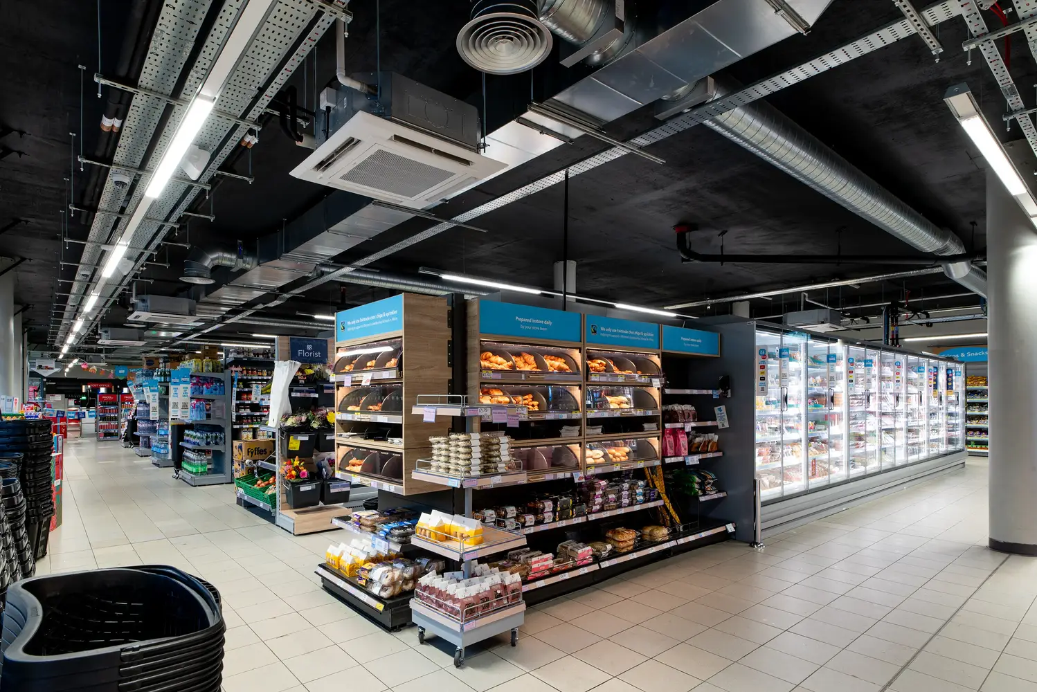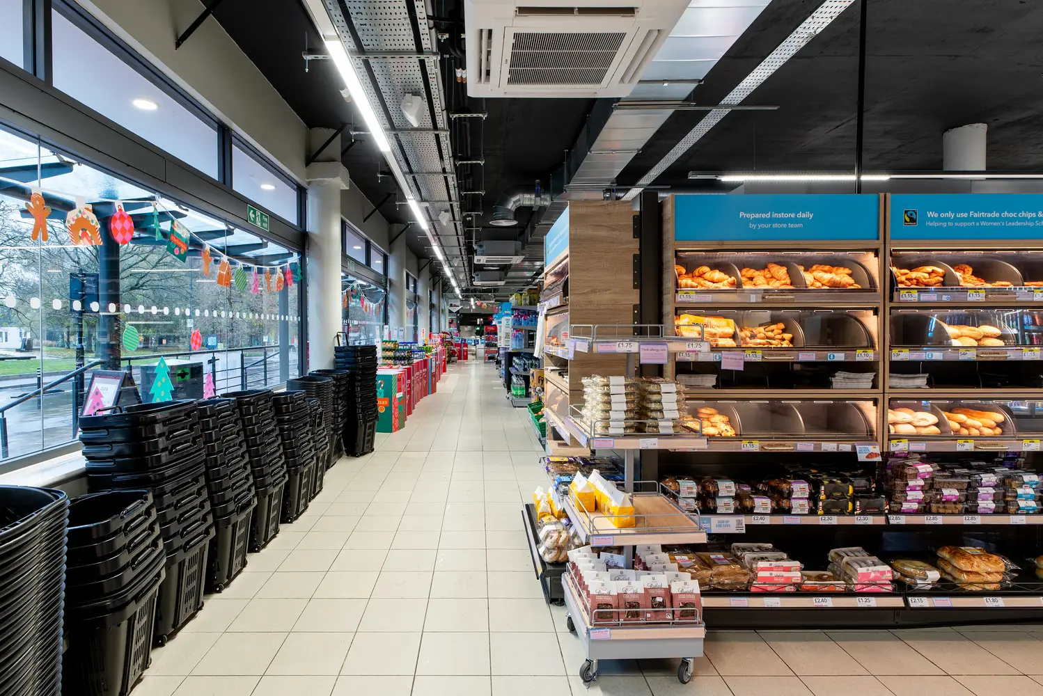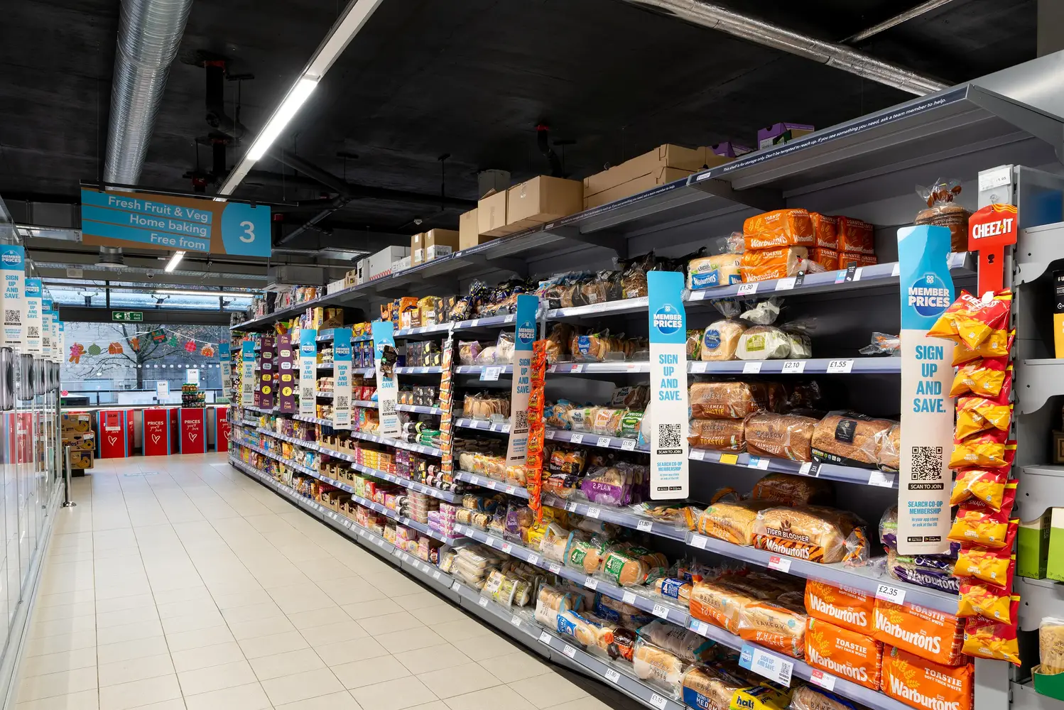 To provide essential safety lighting, Firefly emergency luminaires with area and corridor distribution have been installed throughout the store, with Lexi-65 exit signs highlighting escape points. The wireless SmartScan lighting management system controls the supermarket lighting.