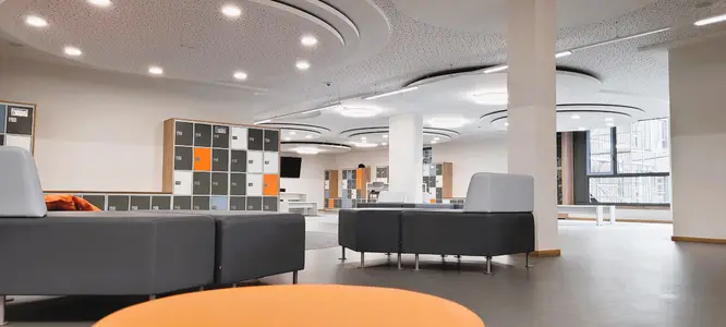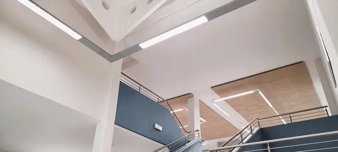 The school building features nearly 1,000 Thorlux luminaires, including Radiance, Thoroproof, Ovix, Zipline, Light Line, Clara 720 and R3. Realta and Juno outdoor luminaires are installed in the school playground. The SmartScan system controls all the school's lighting wirelessly. The school's large window fronts let plenty of daylight into the corridors and rooms, supported by the automatically adjusting, energy-saving LED lighting.