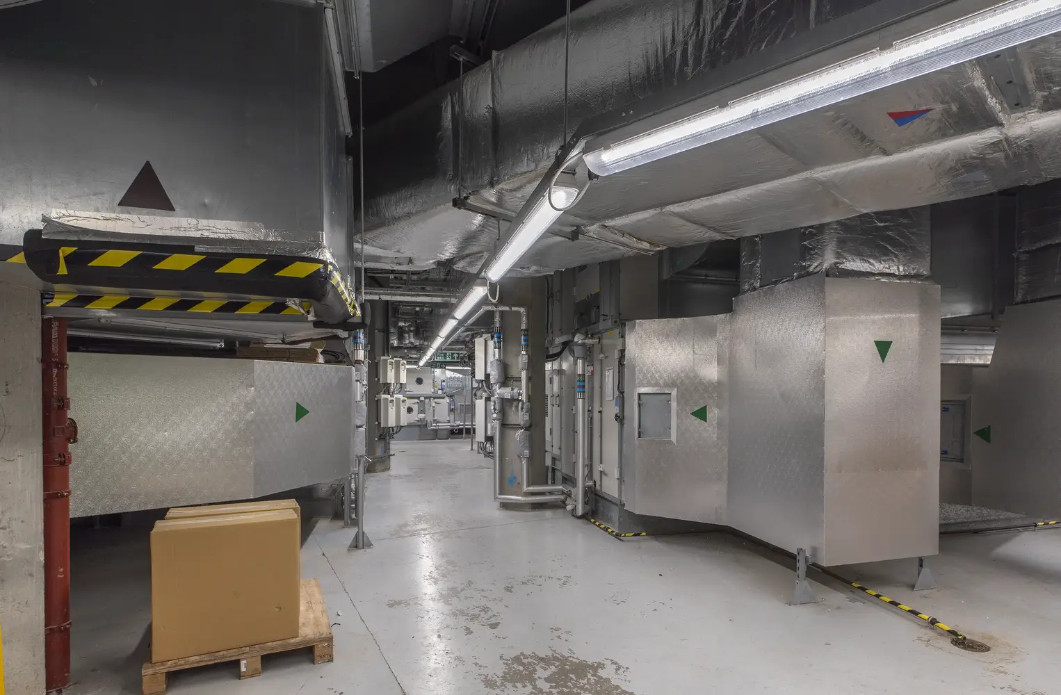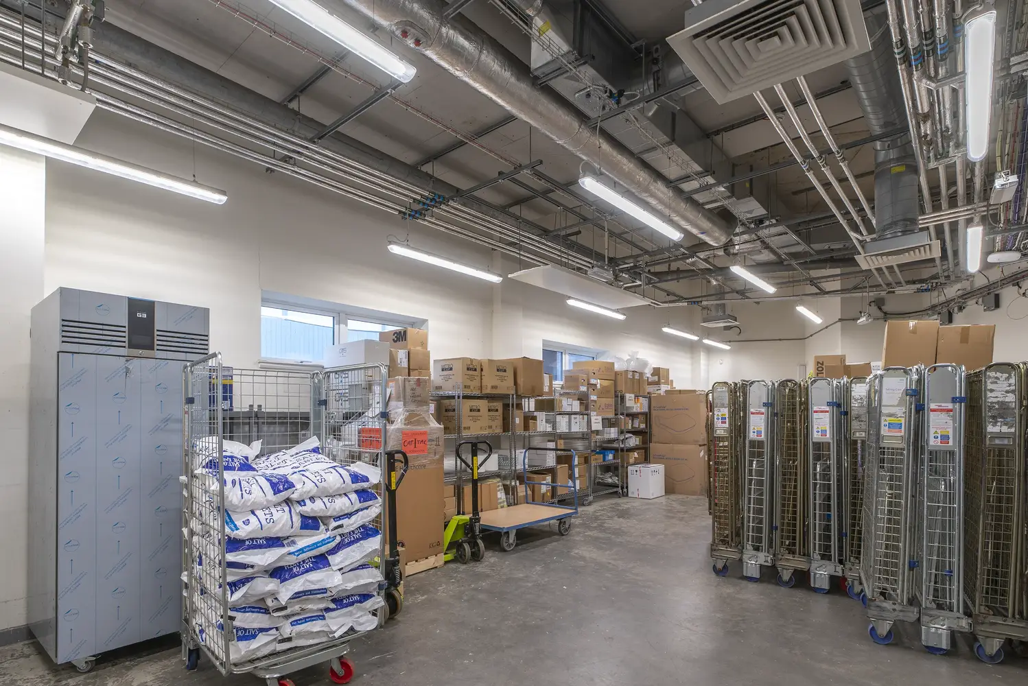 Corridor lighting in healthcare settings demands priority consideration for patient wellbeing; luminaires mounted directly overhead will subject patients on trolleys to uncomfortable glare. Thorlux used Radiance Corridor off-centre luminaires with asymmetric distribution to avoid this. Away from patient areas, essential backroom and plant-area lighting is provided using durable, IP-rated Thoroproof linear luminaires – a tried, proven solution for these applications.