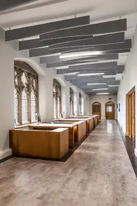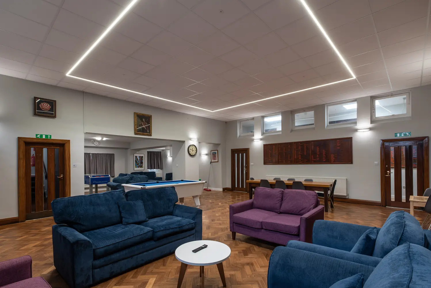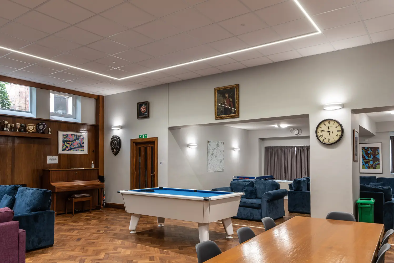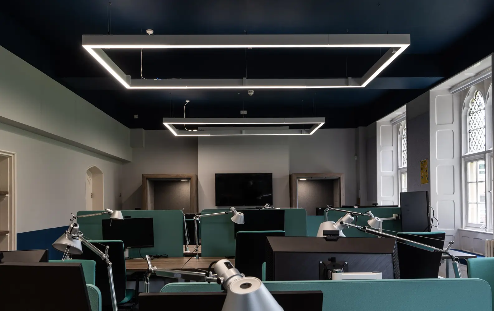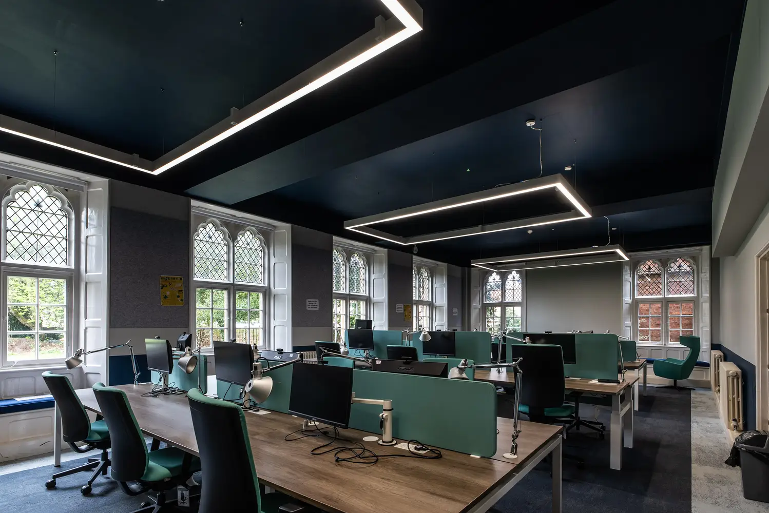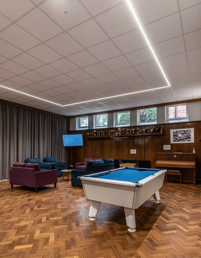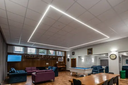 The Flexline has been installed in the common room areas, taking the lighting outside of the ceiling tile offering freedom and flexibility of scheme design. The super narrow 24mm profile is designed specifically for mounting to an exposed T-Bar ceiling and contains sophisticated optical elements making the Flexline a unique, highly efficient luminaire. To complement the design of the Flexline, Hi-bar luminaires have been suspended in the IT areas.