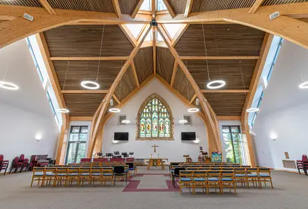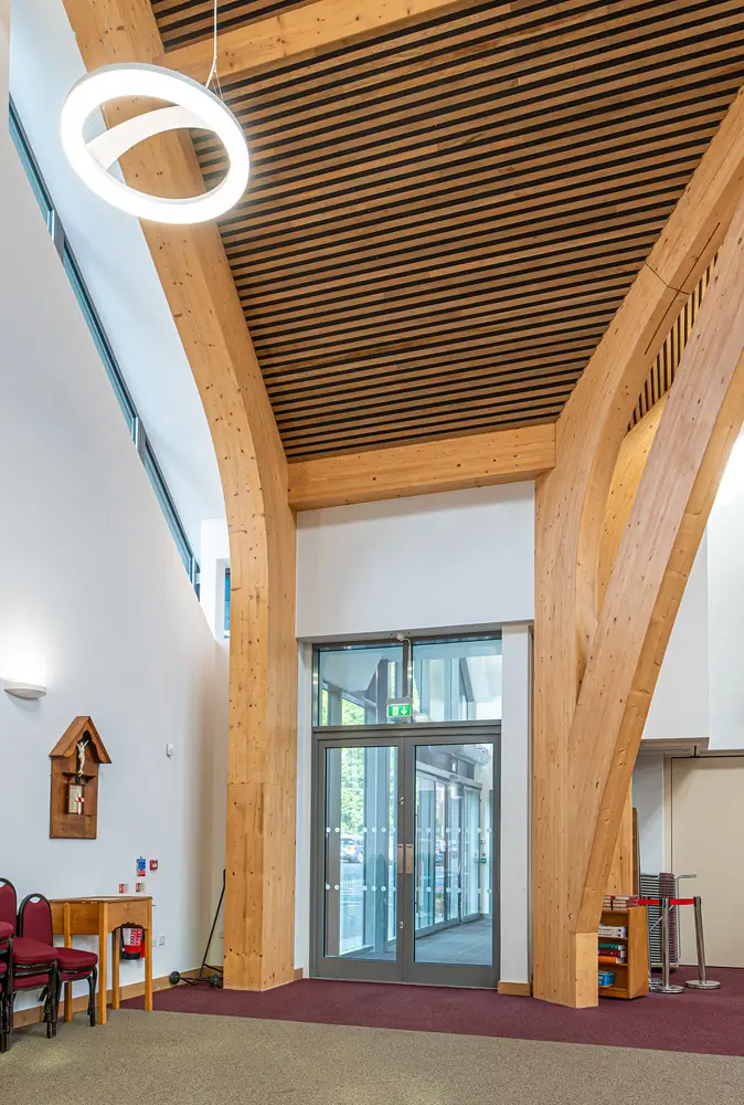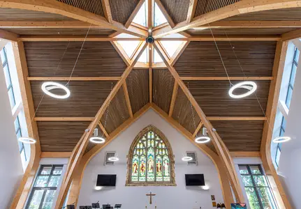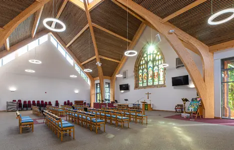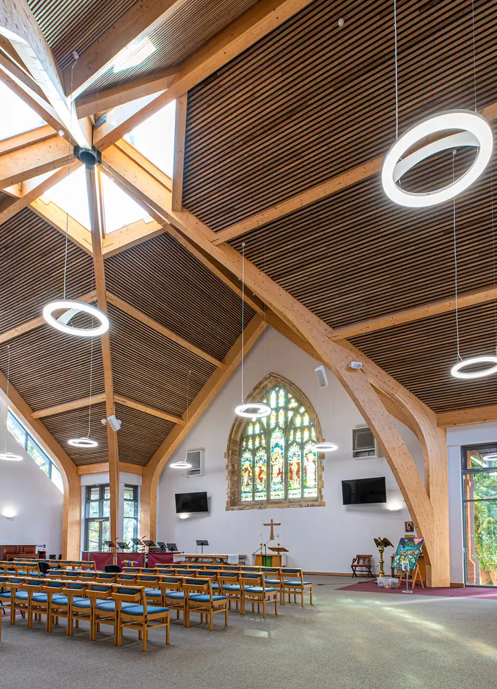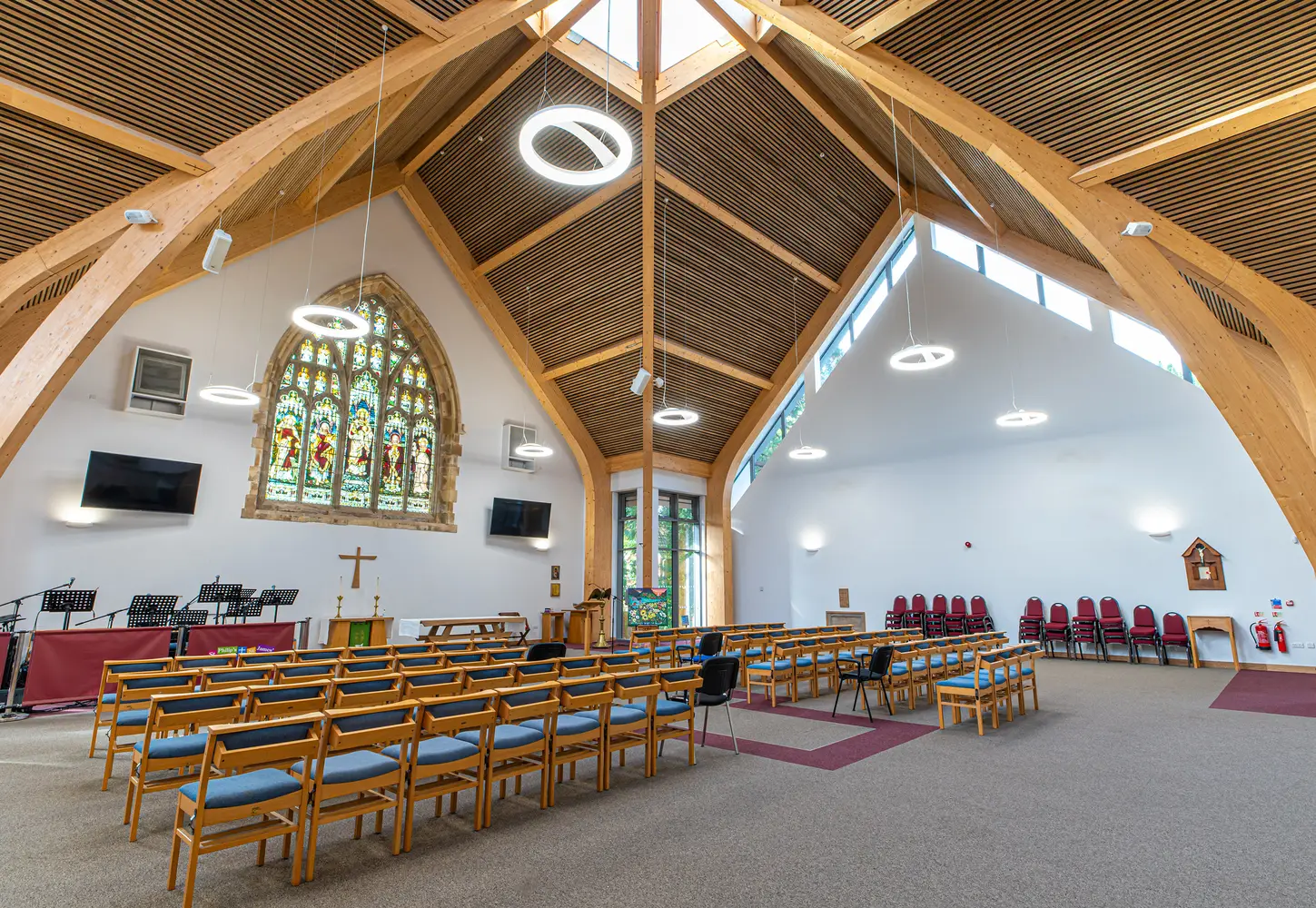 The congregation raised nearly £4.25 million for the new building, which has been designed to meet exacting environmental standards. It offers a range of facilities for the local community, including a main worship space with a capacity of 450, a sports hall and youth room, meeting and counselling spaces, a coffee lounge, and more. The main stained-glass window from the original church was preserved and installed in the new building.