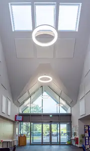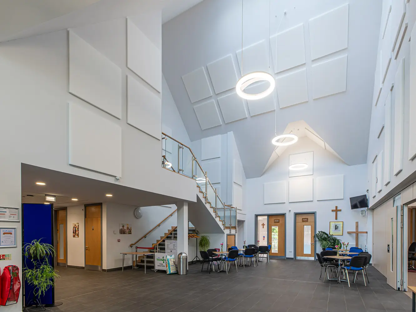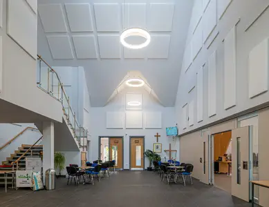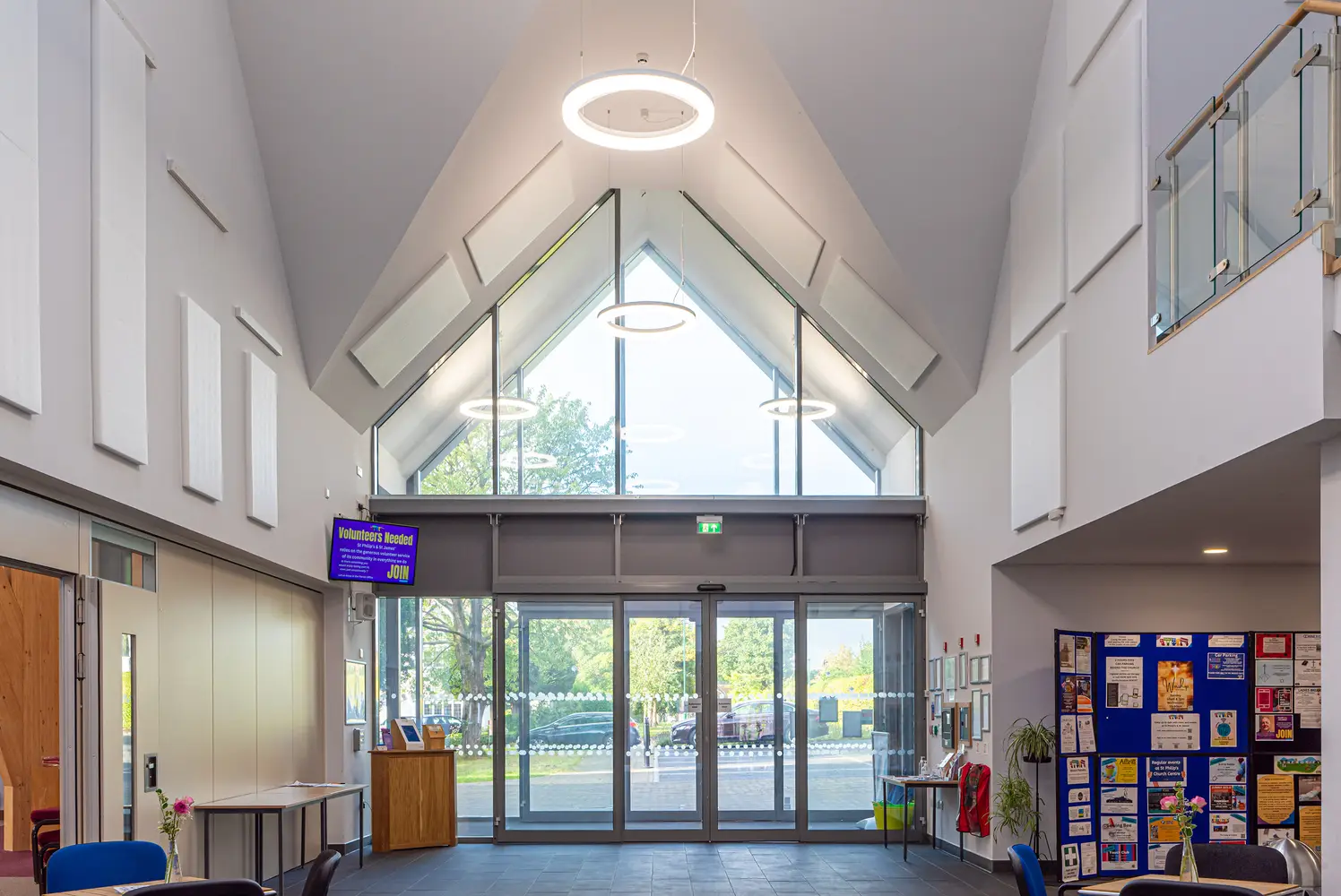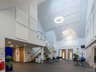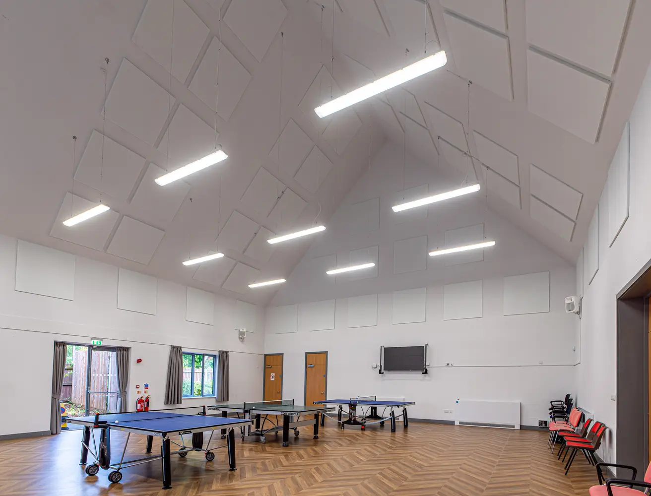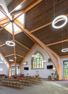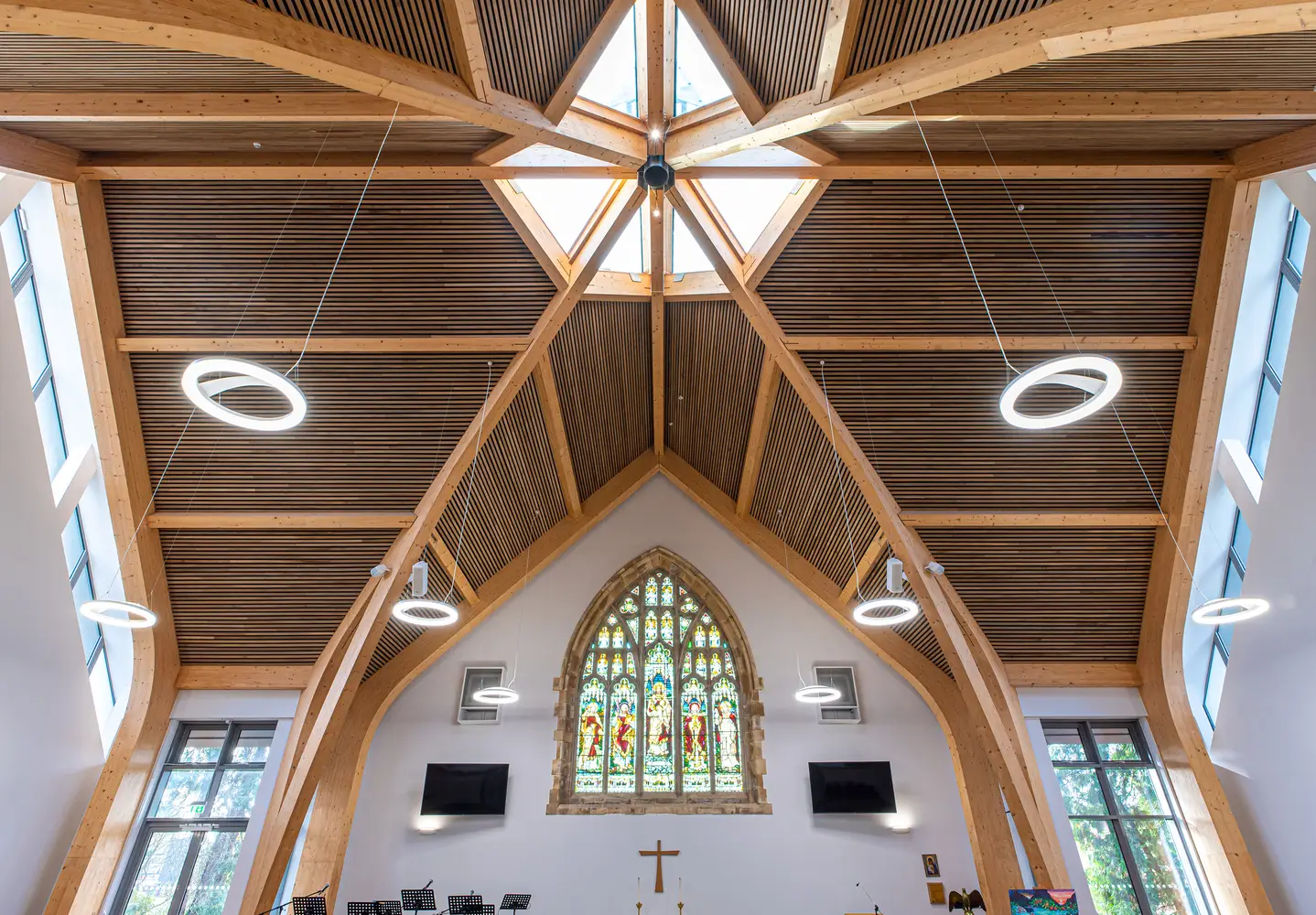 St Philip’s has been lit throughout using energy-efficient Thorlux luminaires. Suspended Clara 720 luminaires light the main worship space and communal area, supported by wall-mounted Clara 180 uplighters. Ancillary areas are lit with ceiling-mounted Radiance luminaires and G3 downlights. IP66-rated, wall-mounted Cobalt luminaires provide perimeter lighting around the outside of the building, while LEX illuminated exit signs and Duo-Spot twin spots ensure essential emergency lighting coverage.