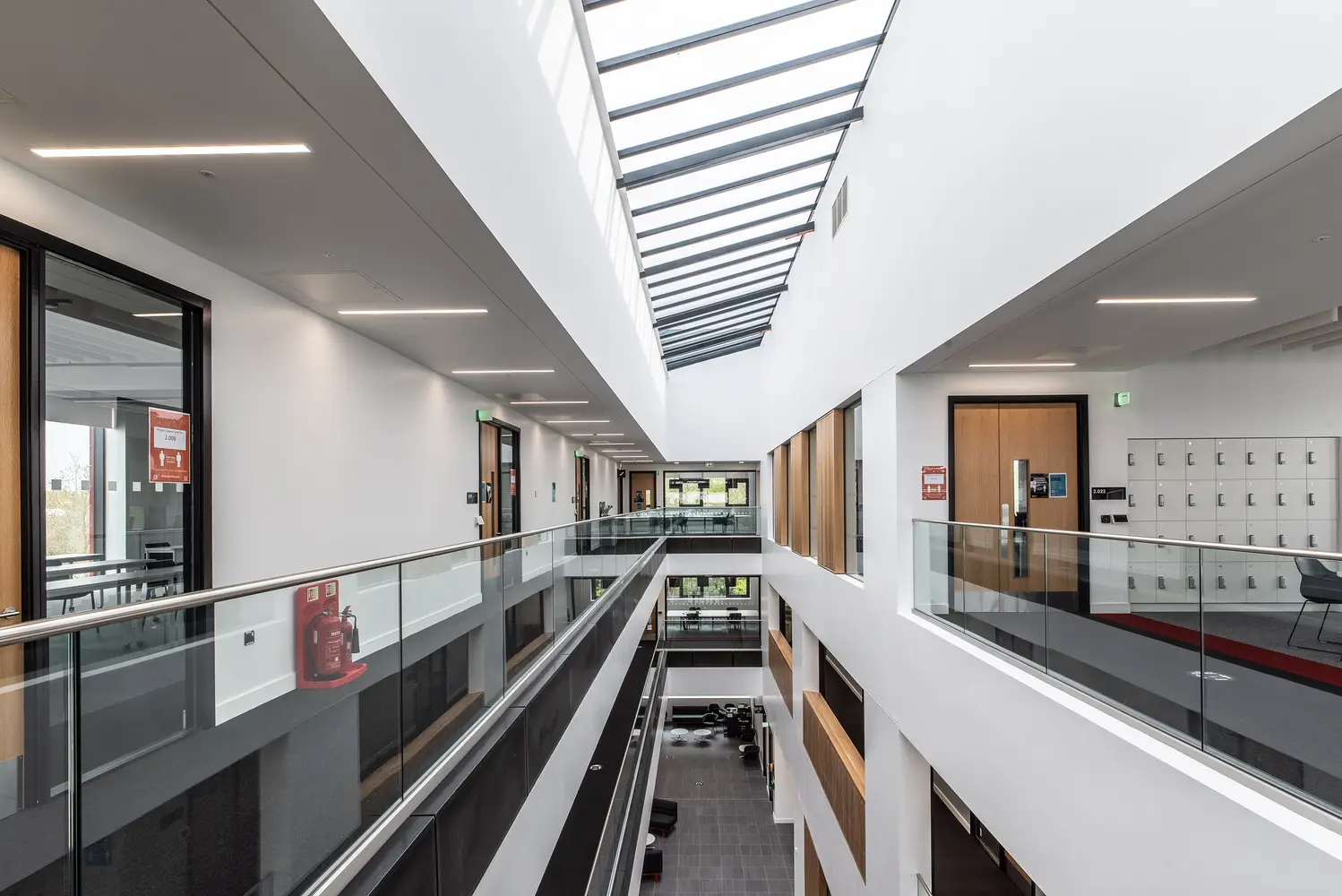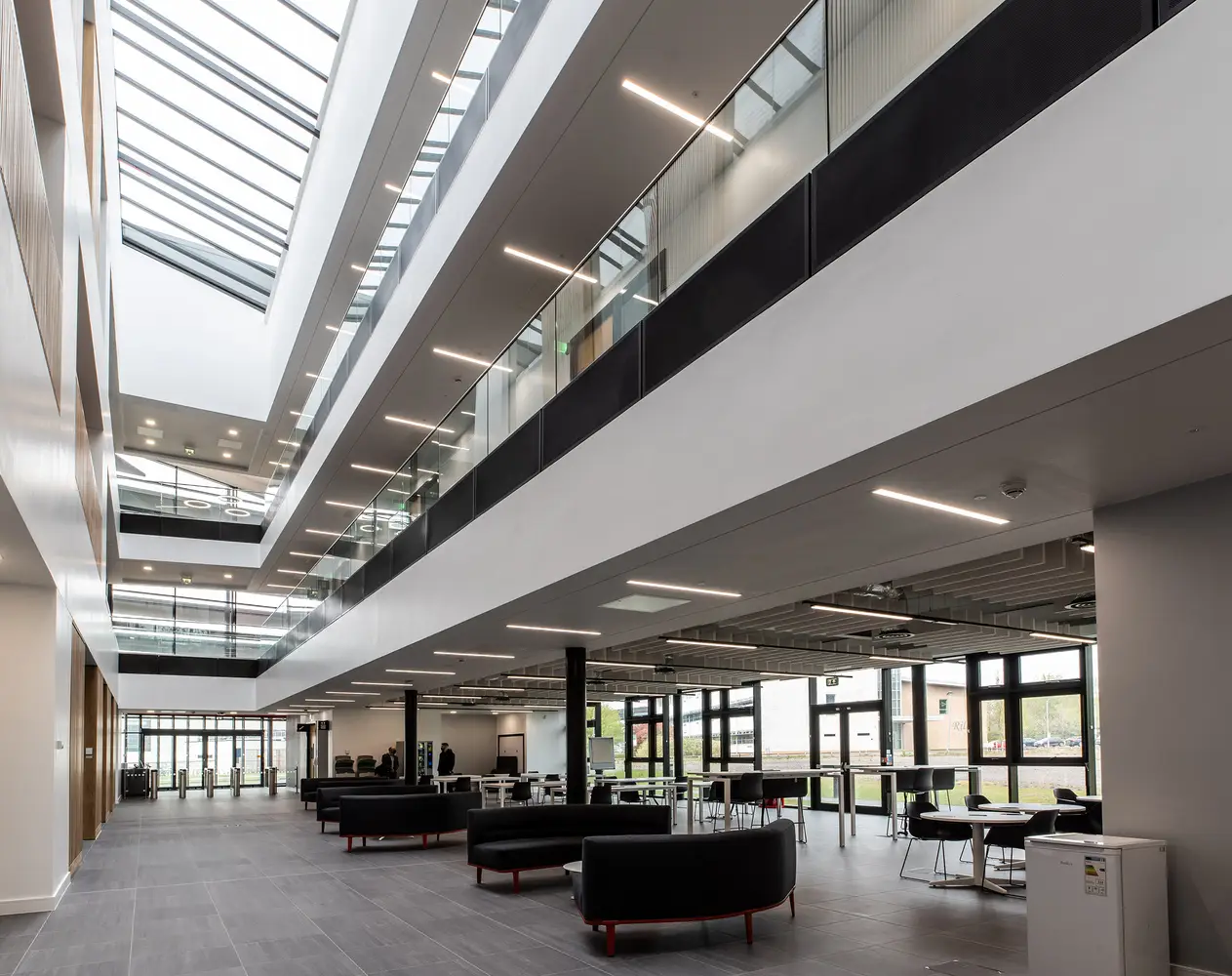Clara 720 luminaires were chosen for the entrance atrium space. The unique design of the Clara 720 delivers a versatile lighting solution for a wide