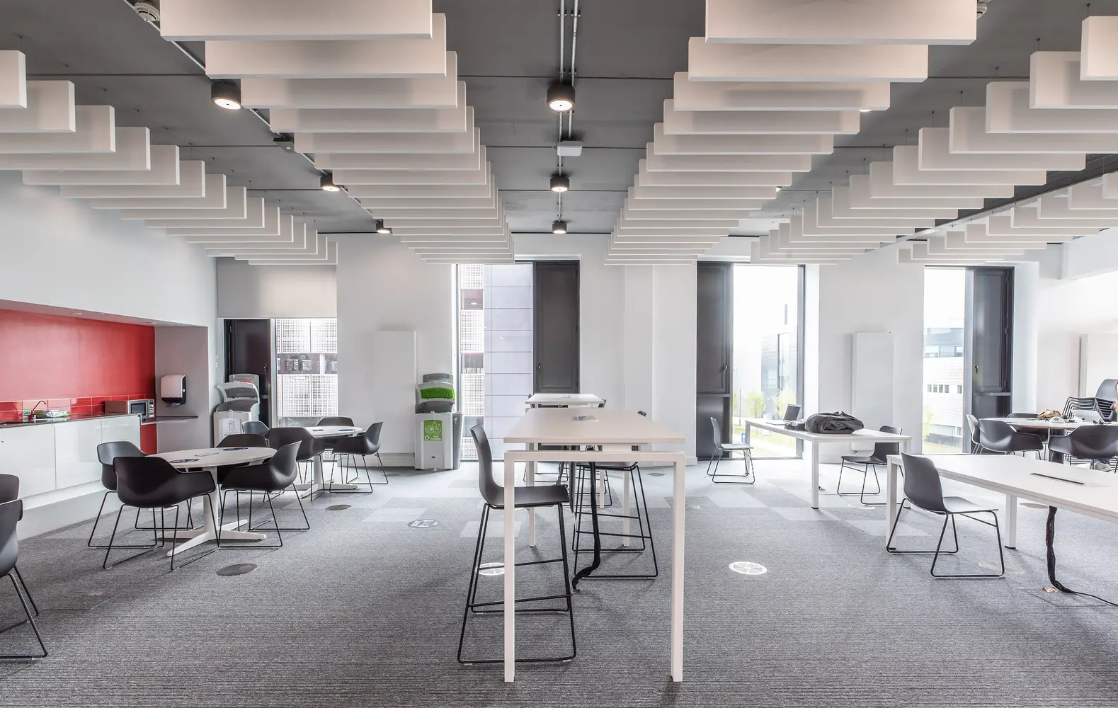 The Zipline has been installed in the open plan study areas. The Zipline combines architectural impact, longevity and supreme efficiency . Extruded aluminium trunking is connected to a range of luminaire modules. These modules can be a combination of luminaire, emergency luminaire, spotlight and passive infra-red detector and are designed to snap into sockets located at regular intervals, ensuring a fast, flexible installation. The Zipline is available with five power options, broad, narrow and double asymmetric light distributions and a variety of accessories.